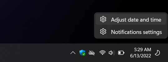 - Right-click the Clock on the taskbar and select Adjust date and time.
