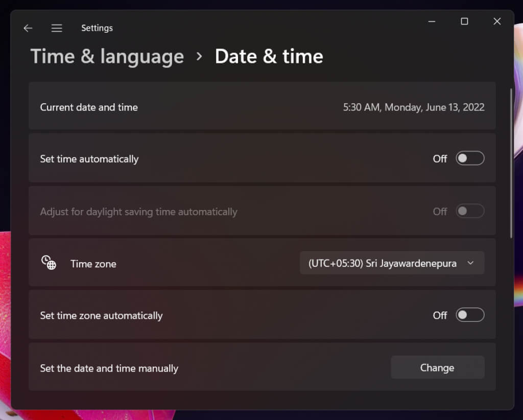 On the Settings window that launches, disable the switch next to Set time automatically. Also, turn off the Set time zone automatically setting (if active).