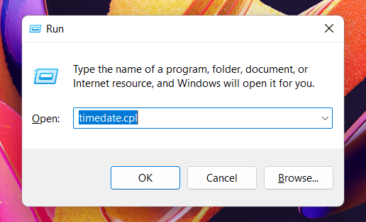 - Press Windows Key + R, type timedate.cpl, and press Enter.