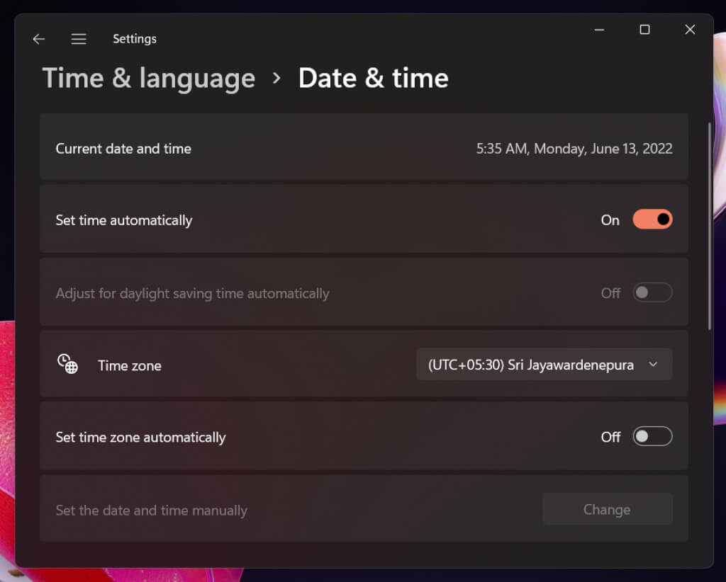 Note: If the time zone always appears incorrectly, make sure to disable the switch next to Set time zone automatically, select your region manually, and then toggle the Set time zone automatically switch off, then on.