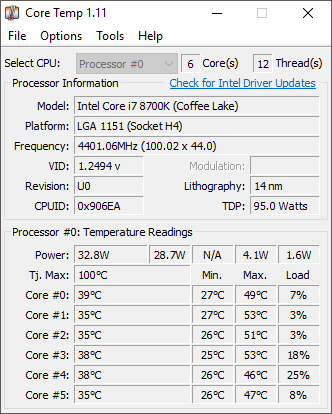 Once Core Temp is open, you can view your average CPU temperature by looking at the bottom right hand side of the window. You’ll be able to see the min and max values****in Celsius. Below you’ll see what Core Temp looks like for an AMD processor and an Intel processor.