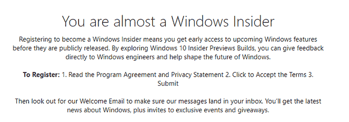 - At the Windows Insider sign-up page, accept the terms and conditions by scrolling to the bottom of the page and clicking the checkbox. Click Submit once you’re ready.