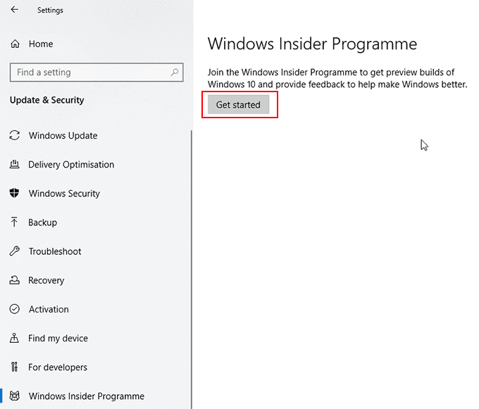 - Once you’re in the Windows Insider Program menu, click Get Started to begin the installation process.