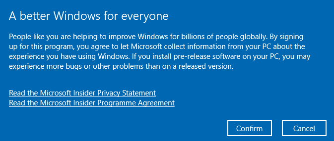 - Windows will ask you to confirm the Windows Insider terms and conditions. Click Confirm to proceed.