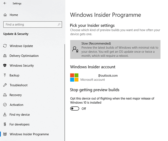At any point, if you want to return to using Windows Installer builds, change the Stop getting preview builds slider back to Off. Return to Settings > Update & Security > Windows update and check for updates to begin downloading your latest Windows Insider build.