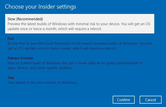 You’ll be asked what “pace” of Windows Insider updates do you want to receive. You can find out about the different Windows Insider build options at the Windows Insider website.