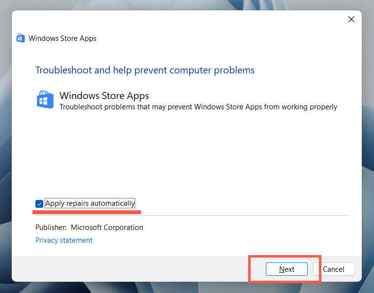Open the Start menu, type Windows Store Apps, and select Open. Then, select Advanced > **Apply repairs automatically **> Next to detect and fix Microsoft Store-related issues.