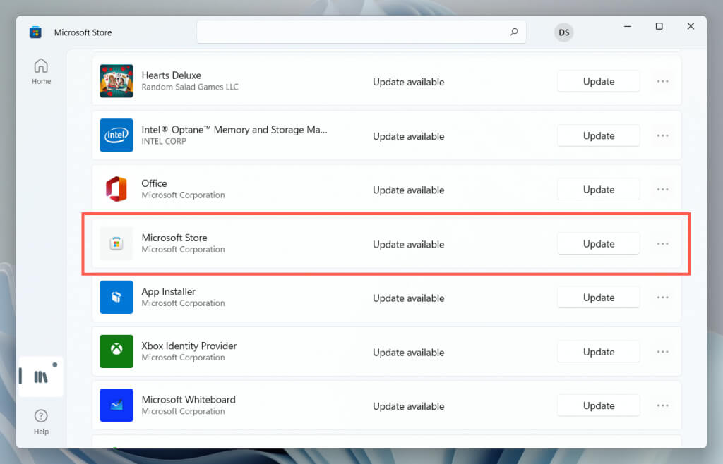 Open the Microsoft Store. Select Library at the lower-left corner and choose Update next to Microsoft Store.