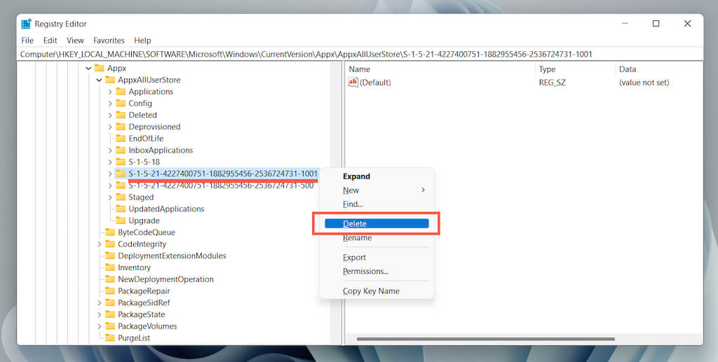 HKEY_LOCAL_MACHINE > **SOFTWARE **> **Microsoft **> **Windows **> **CurrentVersion **> **Appx **> AppxAllUserStore
