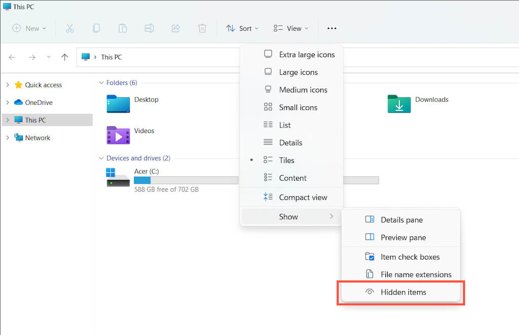 - In File Explorer, open the** View menu **and select Show > Hidden items.