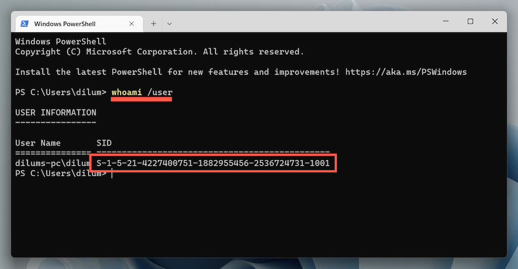 - Open a Windows PowerShell or Command Prompt console. Then, run the whoami /user command and note the string under the SID column.