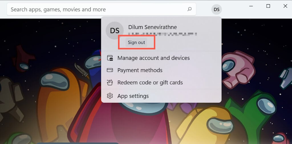 Open the Microsoft Store. Choose your profile portrait and select** Sign out** under your Microsoft Account. Next, restart your PC and sign back into the application.