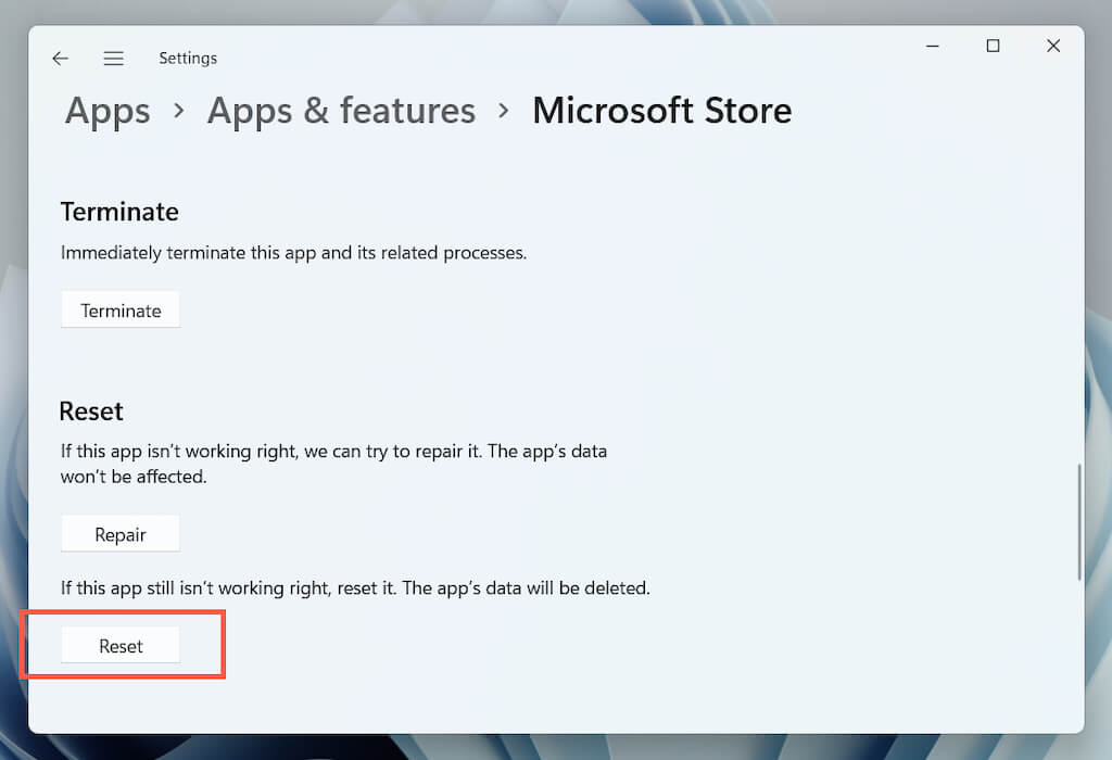 - Selectthe **Reset** button to delete the Store cache and revert the browser to factory defaults. If that fails to fix the Microsoft Store, select the **Repair** button to repair the Microsoft Store installation.