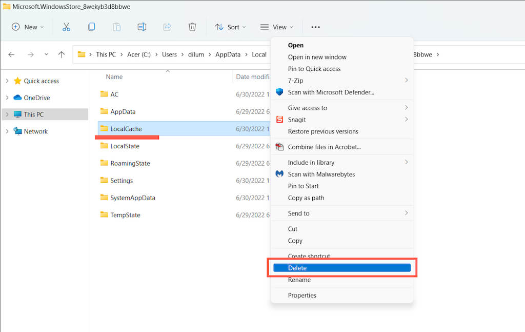 The following approach lets you delete the Microsoft Store’s cache files directly via File Explorer.