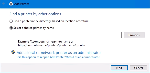 Here’s a way to install a printer that’s different from what you may be used to. It requires that the printer is shared and on the network. Unless you’re the administrator, the driver needs to be installed on your local machine or server. You need to know the path to the share as well. It will look something like Print-Server-Name, where Print-Server-name is the name of the server.