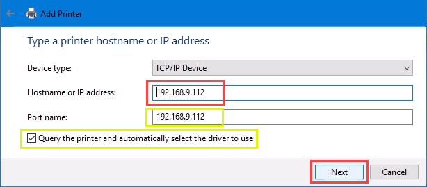 Enter the IP address in the **Hostname or IP address: **field. Notice how the **Port name: **field auto-populates with whatever is entered. The port name can be left as is or changed. In most cases, **Query the printer and automatically select the driver to use **remains checked.