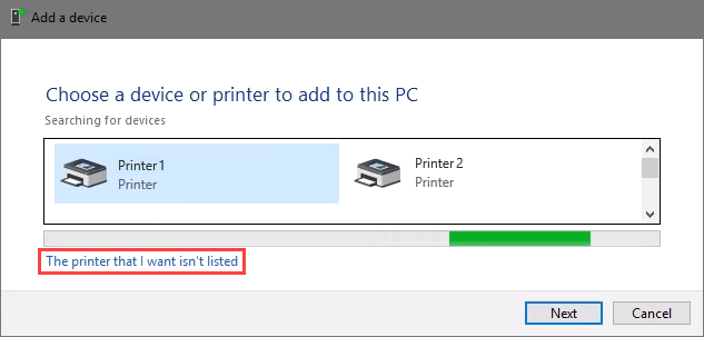 - At the Add a device window, select The printer that I want isn’t listed.