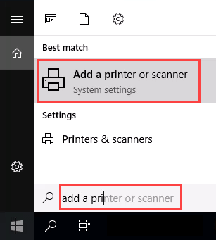 - * In the **Start **menu, type add printers. When the result Add a printer or scanner shows, select it.