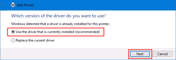 - Normally, Windows will find a driver already installed, offer the option to replace the driver, or ask to install a driver. If it’s on the network already, it probably installed the driver already. Select **Use the driver that is currently installed **and select **Next**.