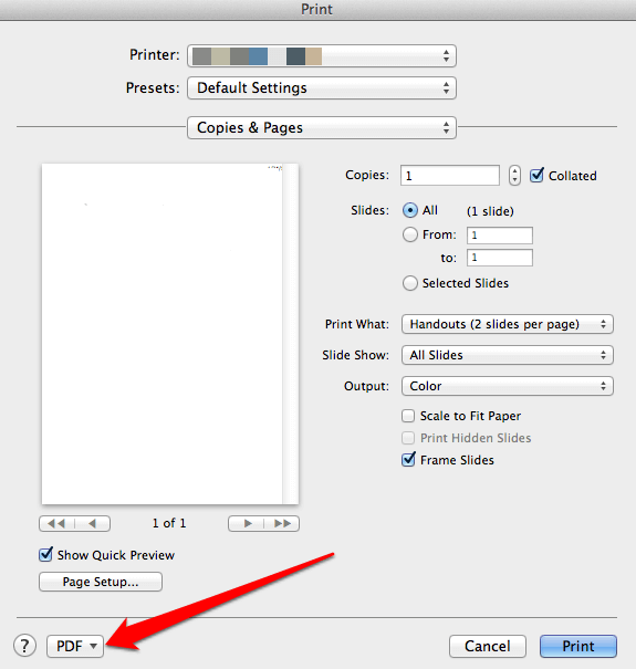 - In the new menu, click **PDF** in the bottom left corner.
