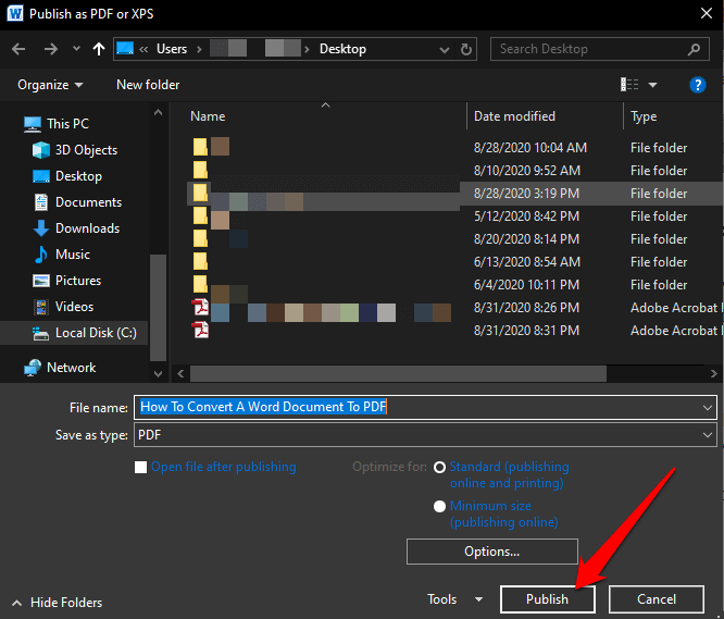 - Give your PDF file a **title**, select where you want to save it, and then click **Publish**.
