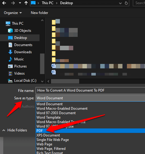 - Click on the **Save As Type** dropdown menu in the **Save As** dialog and select **PDF**.