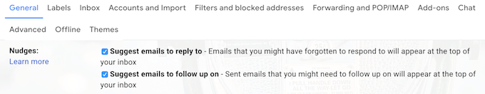 To enable this feature, go to Gmail Settings. Scroll down under General until you find Nudges. Then click one or both boxes to enable the suggestions.