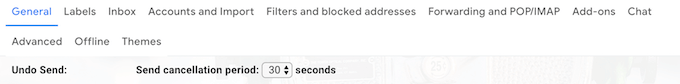 To set it up, go to Gmail Settings. Under General, scroll down until you find Undo Send. There you can choose the send cancelation period, from 5 to 30 seconds after you send the email.