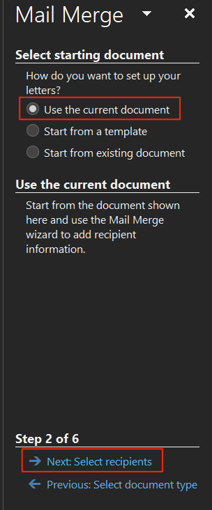- On the following screen, Word will ask what document you want to use for mail merge. Click the **Use the current document** option to use your current letter for the task. If your letter is in another Word file, click the **Start from existing document** to open that file. Then click **Next: Select recipients** at the bottom.