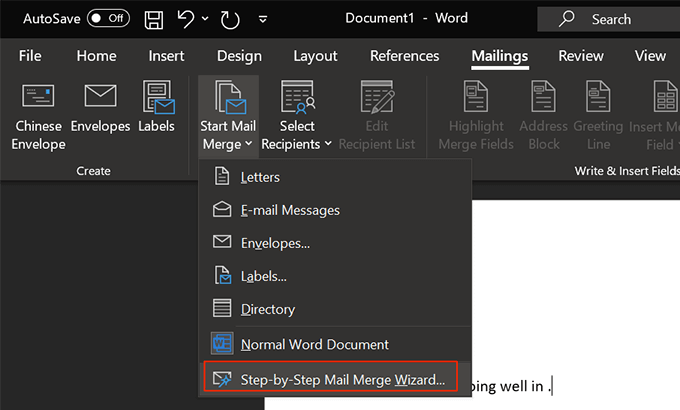 - While your letter is still open in Word, click the Mailings tab at the top, select the Start Mail Merge option, and choose Step-by-Step Mail Merge Wizard.
