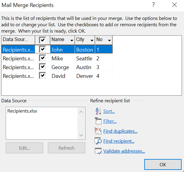 - Word lets you select the recipients you want to use for mail merge if you don’t want to use everyone that’s on the list. Checkmark boxes for the people that you want to include in your letters. You can use the refine options beneath the list to sort and filter your recipients. **Sorting** lets you sort your records in ascending and descending orders. **Filtering** lets you compare the fields and filter out the ones you don’t need. Finally, click **OK** at the bottom.