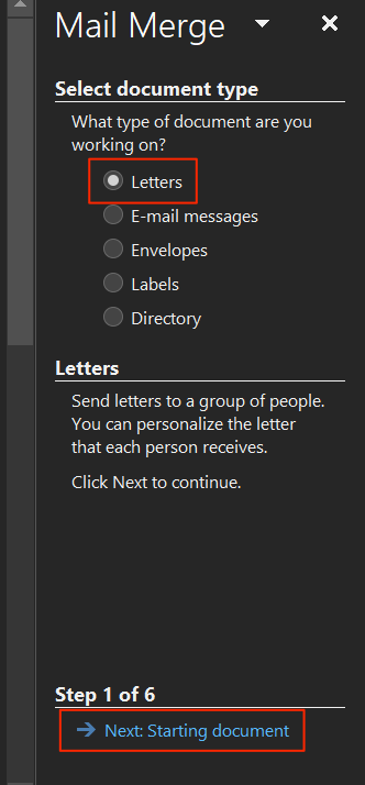 - A new pane will appear on the right-hand side of your screen. Under the first section that says **Select document type**, choose **Letters**. You can choose **E-mail messages** if you want to send your letter via an email. Then click **Next: Starting document** at the bottom to continue.
