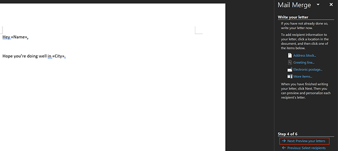 - You’ll want to add all your data fields to the letter so that your letters have all the required information in them. Then click **Next: Preview your letters**.