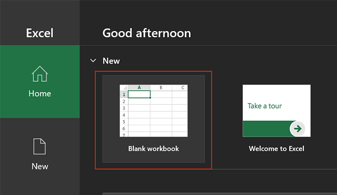 - Click the **Home** tab in the left sidebar and choose **Blank workbook** from the right-hand side pane. This’ll create a blank worksheet for you.