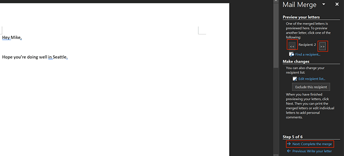 - You can preview the letters that will be generated as the result of your mail merge. Click the left and right arrow icons to view letters for each of your recipients. Then click **Next: Complete the merge**.