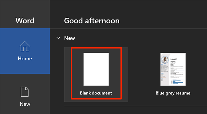 - Click **Home** in the left sidebar and choose **Blank document **from the right-hand side pane. You can use a template as well if you want.