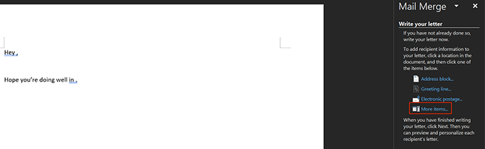 - The following screen lets you use your data fields in your letter. To use this, put your cursor where you want to add a data field in the letter and click **More items **on the right-hand side pane.