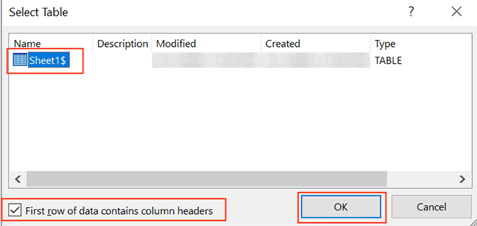 - Navigate to your desktop and double-click the Excel spreadsheet you created earlier. This’ll open the spreadsheet in Microsoft Word. * Word will ask which sheet you’d like to use from your spreadsheet. Select the sheet that contains your data, checkmark the **First row of data contains column headers** option, and click **OK**.