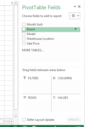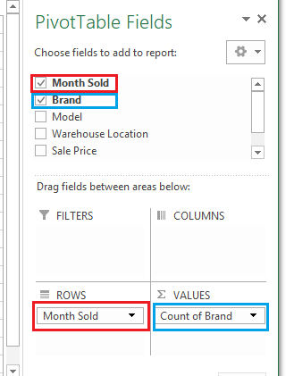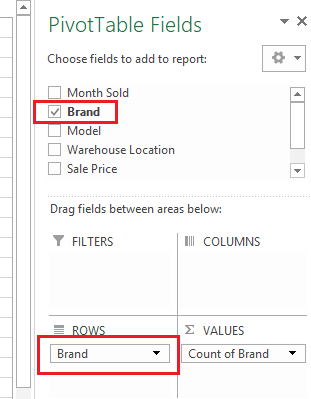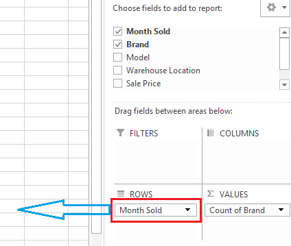STEP 4 – To know the number of mobile phone sold each month, drag Month Sold to the ROWS area and Brand to VALUES area**.**