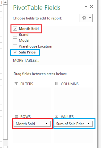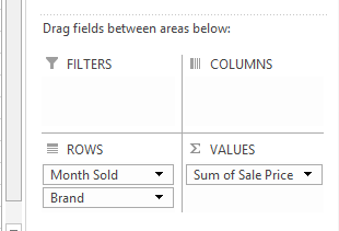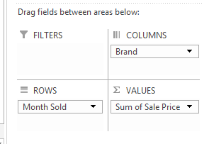 Clear out the Brand field and drag Month Sold back to the ROWS area. As we specifically want to know the total sales, clear the **VALUES **area and drag in Sale Price as shown below.