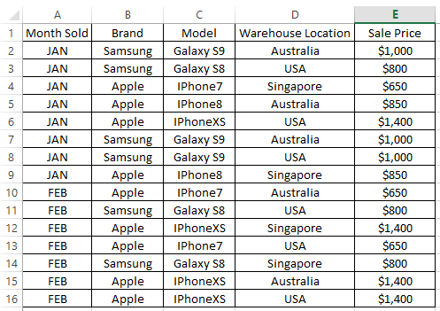 Imagine if you own an online shop that sells different models of mobile phones with sales data as shown below. Download sample spreadsheet.