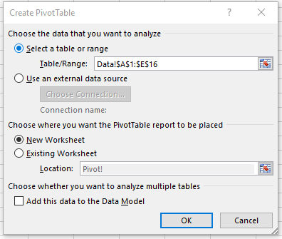 STEP 2 – A selection window will appear and it should automatically determine the full range of the table based on the cell where you clicked earlier. For this example, we’re adding our pivot table to a new worksheet, so it’ll be easier to see.