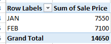 As the Sale Price column in the original dataset is in number format, the pivot table will automatically sum up the Sale Price, instead of counting** **the number of **Sale Price **rows. Voila, you have received $7,550 in JAN and $7,100 in FEB.