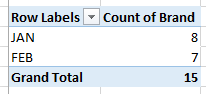 If you drag Model or Warehouse Location to VALUES instead of Brand, it will produce the same numbers for each months as it is simply referring to the total count of rows in each Month Sold. Looks like we sold more phones in JAN compared to FEB.