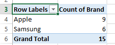 The pivot table will be instantly be updated to show total number of rows, grouped by **Brand **(i.e. Total number of product sold by **Brand **to date). You actually sold more Apple product compared to Samsung.