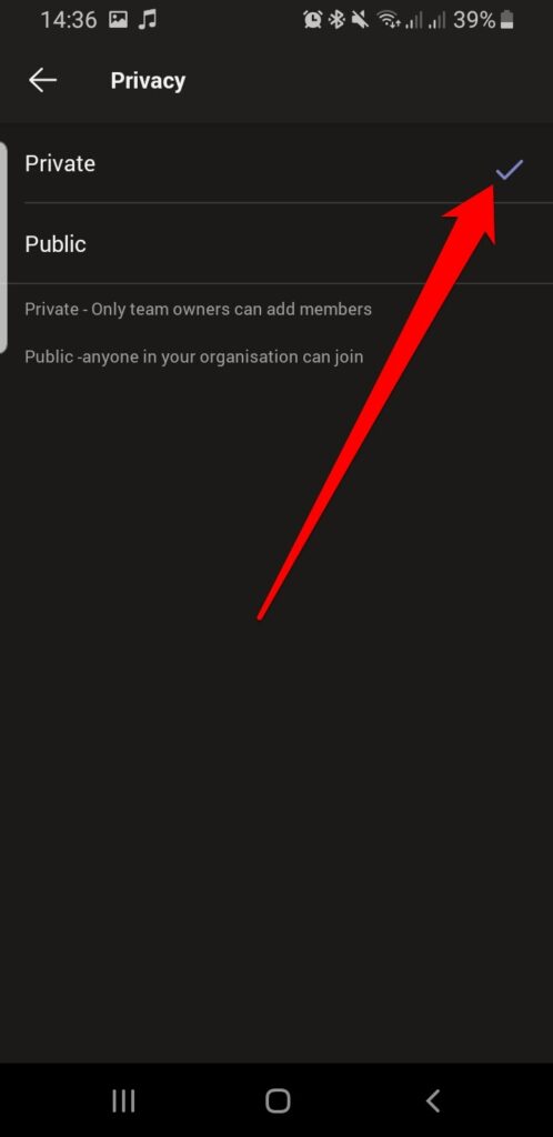 - Select the **privacy setting** for the team: Private or Public.