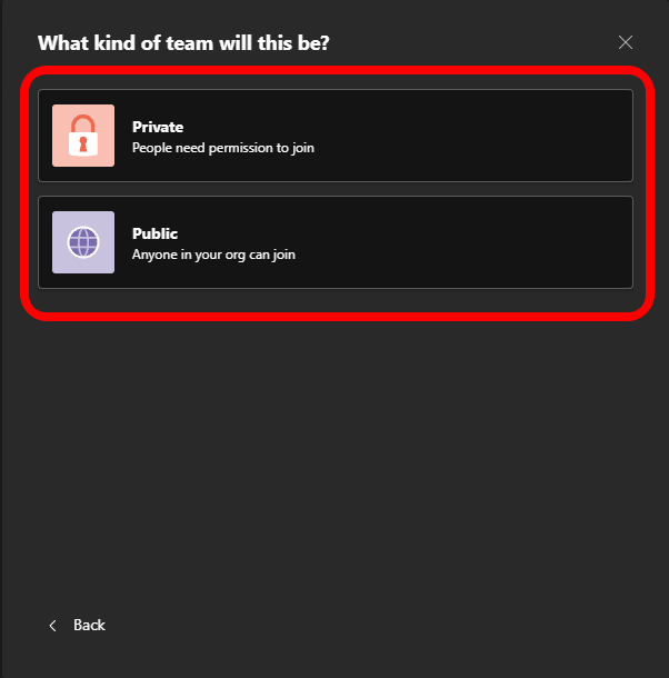 - In the **What kind of team will this be** popup, select Public, Private, or Org-wide:
