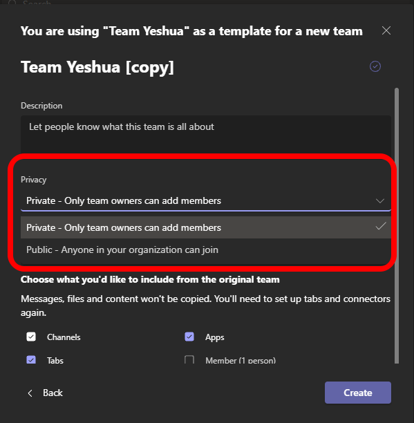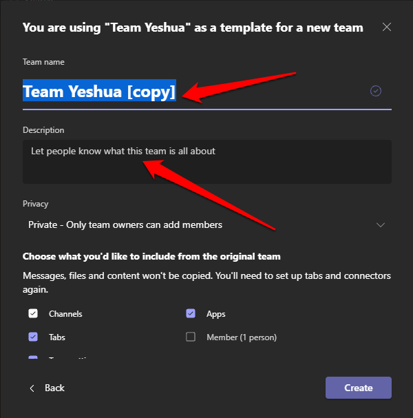 - By default, the team name will be the current one for the existing team and will appear as **Team Name (copy)**. You can give the team a new name and then add a **description**.