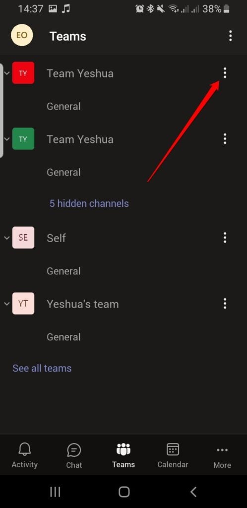 - To delete the team, tap **Options **(three dots) next to the team name.