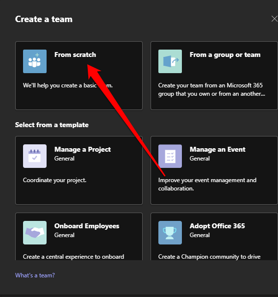 - Go back to the **Create a team** options menu and pick a **template **under the **Select a template** section.